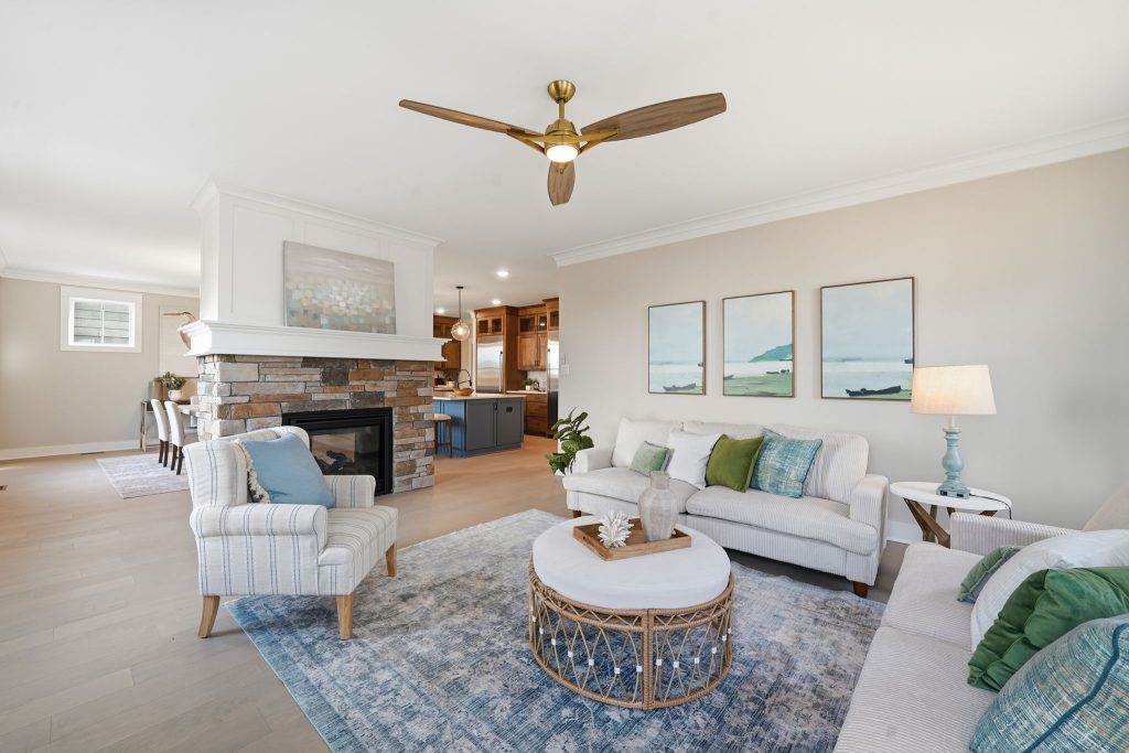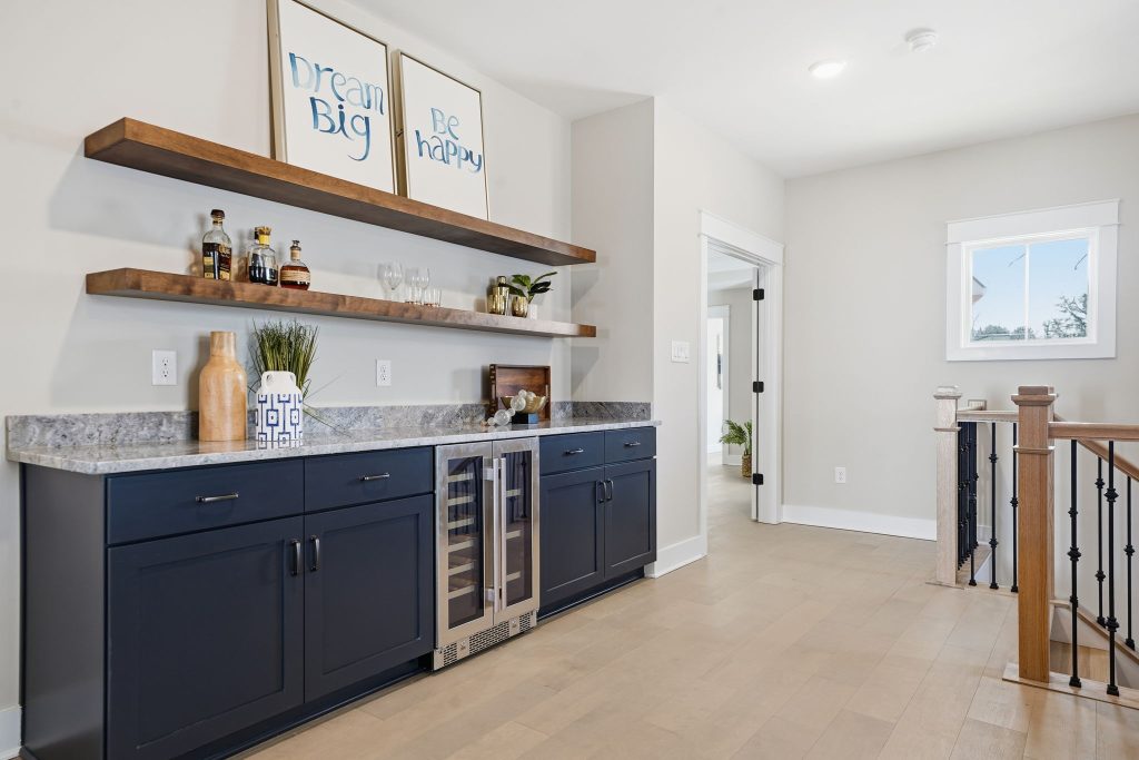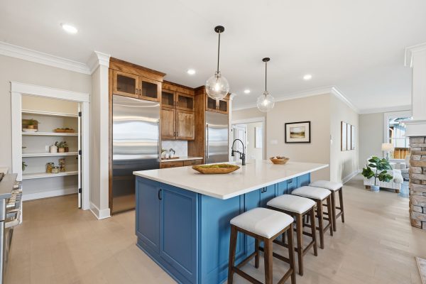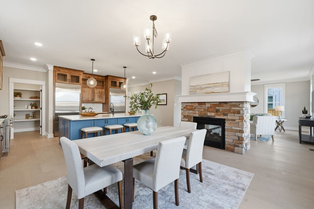 Inside, the open floorplan includes a first-floor private guest suite with full bath and a generous study complete with future elevator capabilities. The kitchen offers a large eat-at island, spacious walk-in pantry, 6-burner commercial style 48-inch gas range, and a selection of upgraded cabinetry supporting quartz countertops. Adjacent to the kitchen is a sizable dining room, big enough for the largest family holiday meal. A two-sided see-thru fireplace separates the distinctive family room from the kitchen and dining areas creating a dynamic focal point.